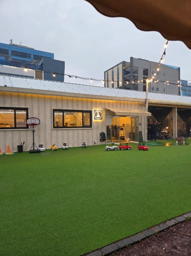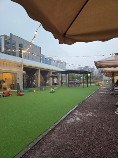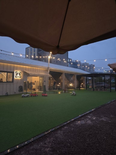 텐트 앞에는 잔디도 깔려있어 아이들이 뛰어 놀수도있고 아이들이 탈수있는 자동차도 여러대 비티되어있어요! 비가 와서 그렇지 비 안올때는 불멍도 가능하게 불도 피워주시는디 아쉽더라구여