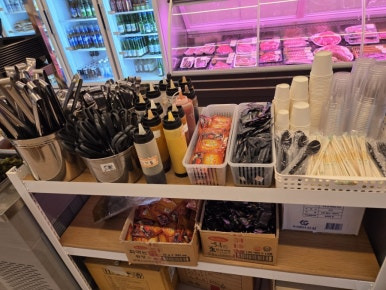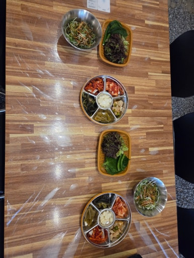 가운데에는 반찬과 쌈류가 있고 추가로 필요하면 가져갈수있게 집게 컵 가위 양념 쌈장등등 비치되어있으니 필요시 가져가면되요